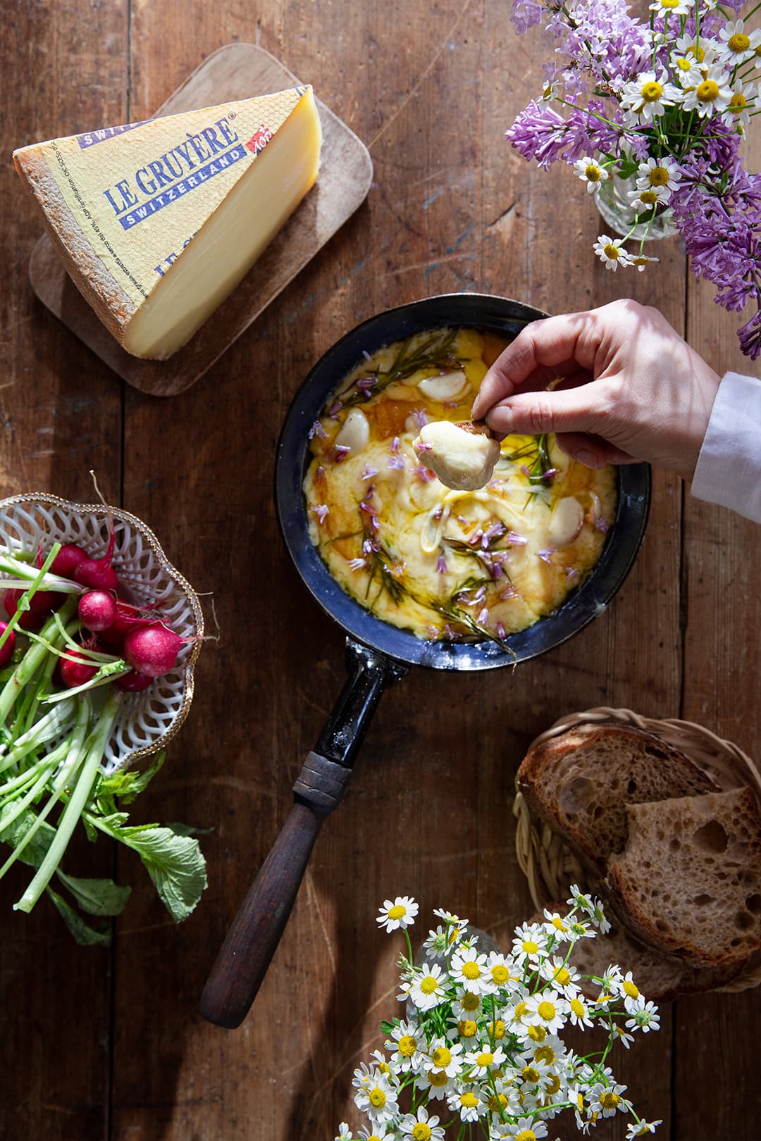 1. Grease a cast-iron pan with canola oil. Cut the cheese onto the pan and add whole garlic cloves and rosemary sprigs. Heat up the pan on a grill with medium heat or in the oven (cover with foil) in 180°C for about 15 minutes. Mix carefully and continue to melt if necessary. Serve the cheese skillet with bread and new potatoes.